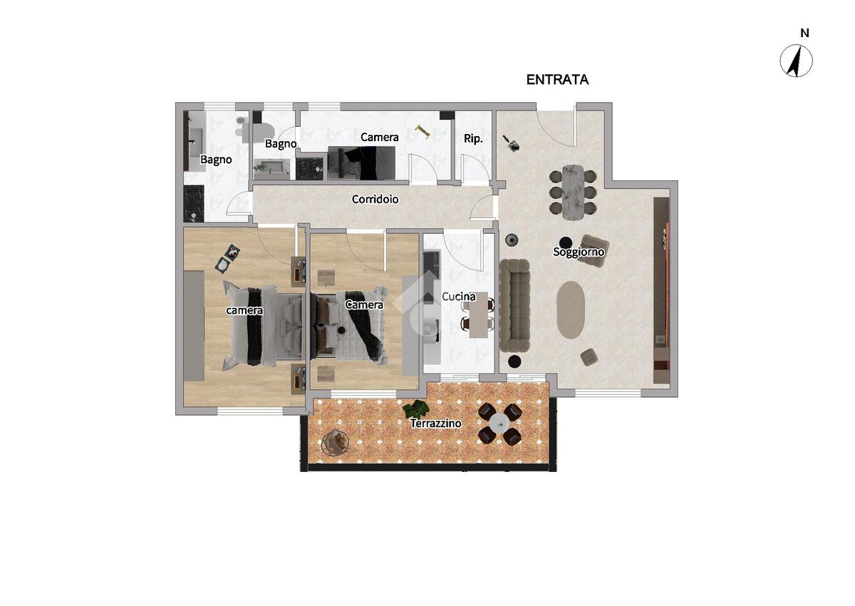 La zona notte offre due camere matrimoniali di ottime dimensioni, oltre a una terza stanza con bagno privato, perfetta come camera aggiuntiva o studio. Completano la proprietà un secondo bagno e un comodo ripostiglio, utilissimo per l’organizzazione della casa.